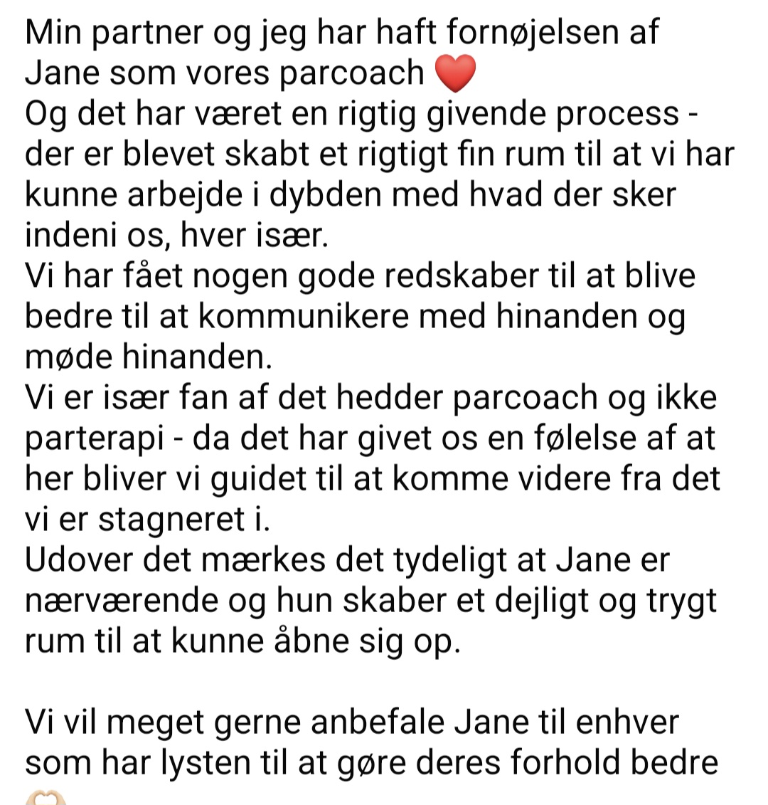 Jeg kender selv til bøvl i relationer. Min mand og jeg har gået i parterapi, og jeg har altid tænkt, at jeg en dag skulle sidde i den stol. På den anden side af parret. Det er så nu. Det er en af grundene til, at jeg selv har valgt at arbejde med par og relationer.